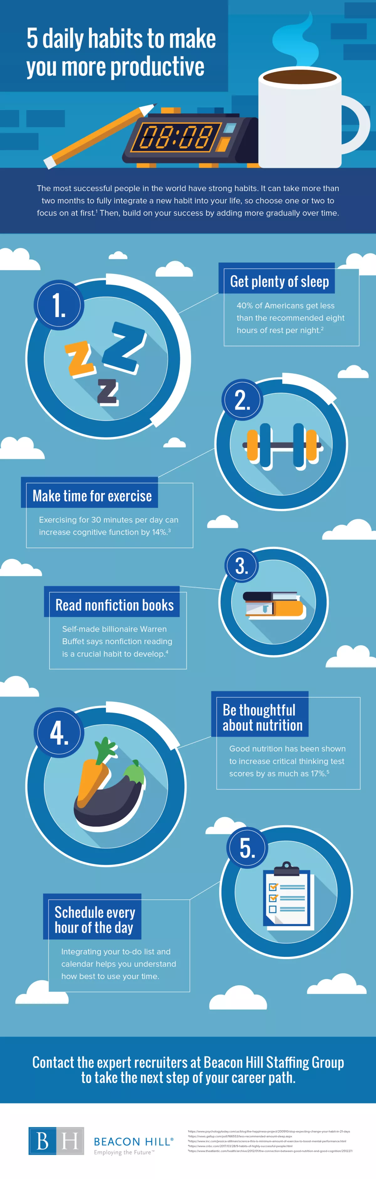 Remember, building habits is more like running a marathon than a 200-meter dash. Start with one habit, and work on maintaining it for a month or two. When it feels like second nature, or when it feels wrong not to do the habit, you can add another one. If you're ready to get started, consider one of the productivity habits from our infographic below: