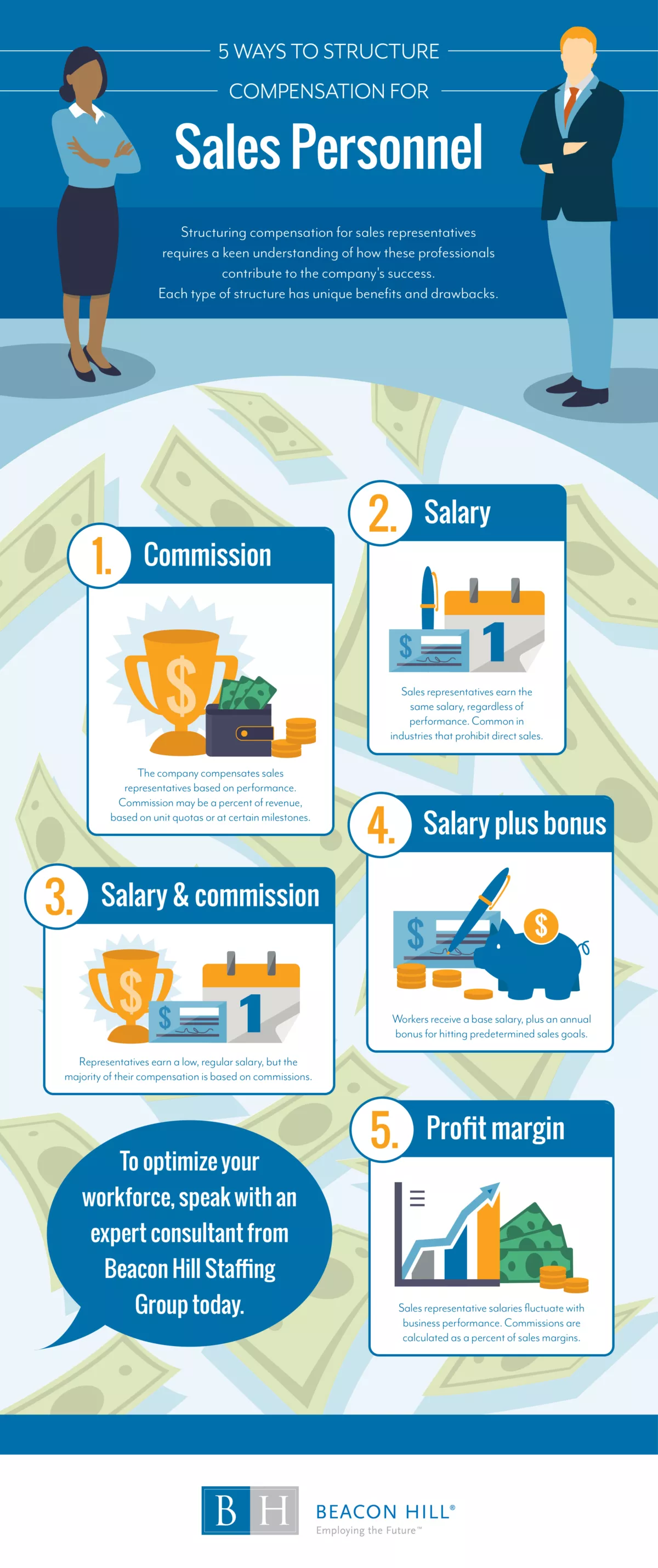 Finding the right compensation plan for sales personnel can be a bit of a balancing act. On one side, you want to fairly reward your sales staff for the revenue they bring to your company. On the other hand, haphazardly committing to a pay structure without assessing your organizational culture and structure may lead to unintended consequences. Additionally, the compensation plan you choose will affect staff motivation levels, as well as retention and employee satisfaction rates.