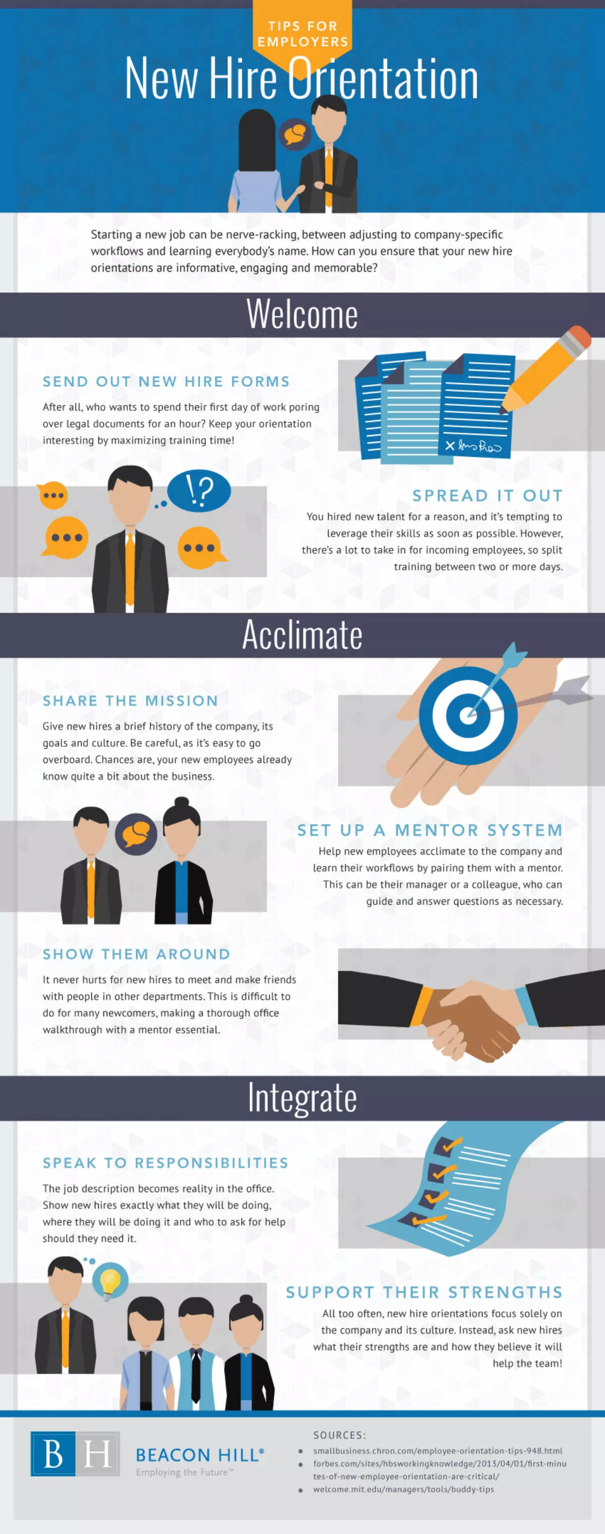 Once new hires have signed on the dotted line, employers need to start thinking about the onboarding process. A proper orientation is essential to making newcomers feel welcome and alleviating their stress. After all, the first few days in a new office can be nerve-wracking, as there are many processes and procedures to learn and a host of new co-workers to meet.