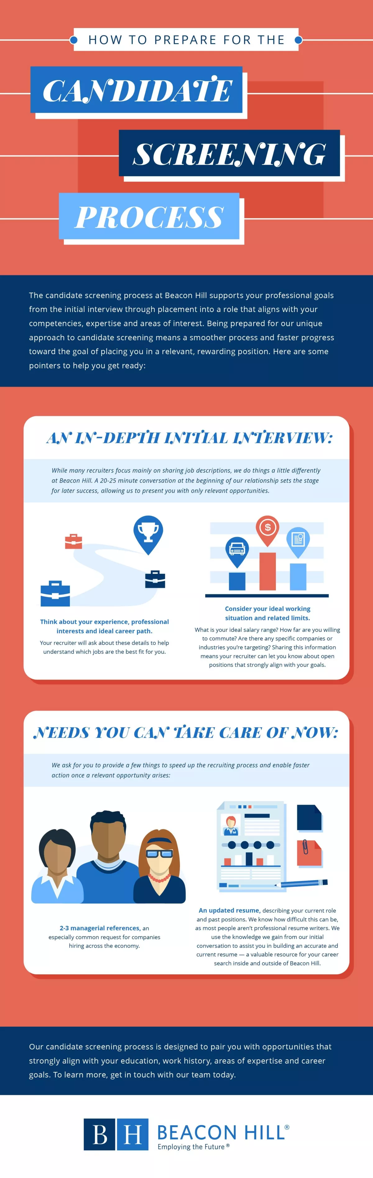 An exceptional candidate screening process is designed to benefit everyone involved: the recruiter, the employer and you, the candidate. Beacon Hill's screening system emphasizes your needs and provides wide-ranging support that can be exceptionally valuable for securing a new position. It all starts with an initial, in-depth interview.