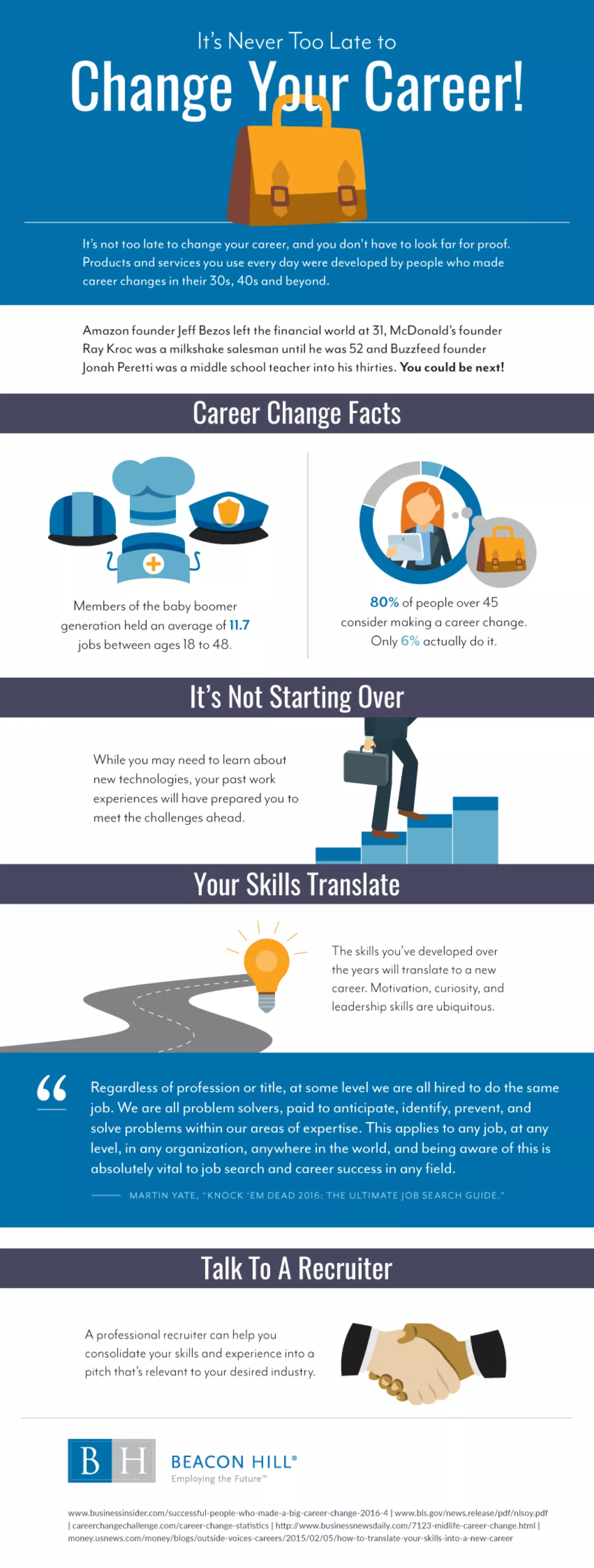 Roughly 80 percent of people over the age of 45 consider making a career change, but only 6 percent actually do it. Follow your dreams and talk with a recruiter today!