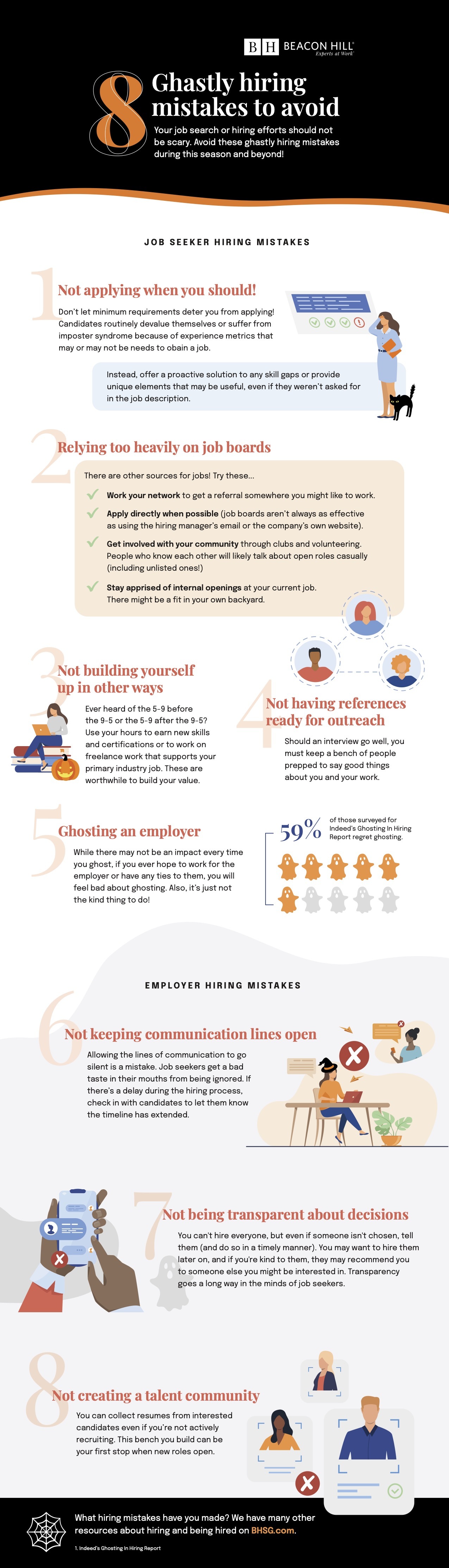 The scariest part of hiring or job seeking is that you're never quite sure when you may be making a ghastly hiring mistake. Don't worry, the experts at Beacon Hill are here to tell you what to avoid (and provide a shareable infographic in case you need it) during the hiring journey.