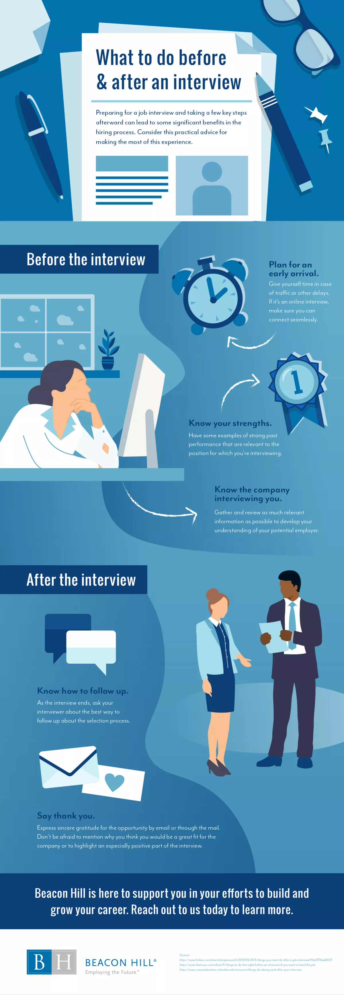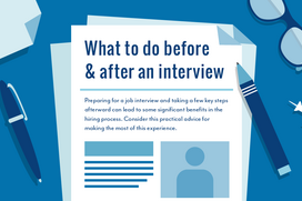 If you have a job interview approaching, there are certain steps to take before and after that can help you stand out from other candidates and boost your chances of moving on to the next interview round or receiving an offer. With some planning and just a little bit of time, you can put your best foot forward. Our infographic "What to do before and after an interview" offers five practical, actionable pieces of advice for everyone in the process of or considering the next step in their career search.