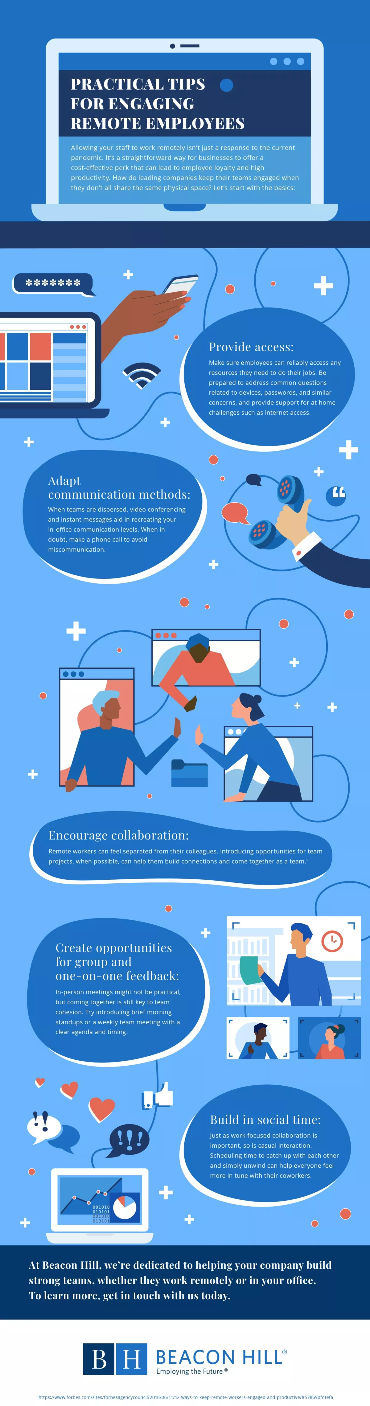 There are plenty of other factors to take into account when developing a strategy for boosting engagement among telecommuting workers. Our infographic, "Practical tips for engaging remote employees," includes a variety of straightforward tips. See it here: